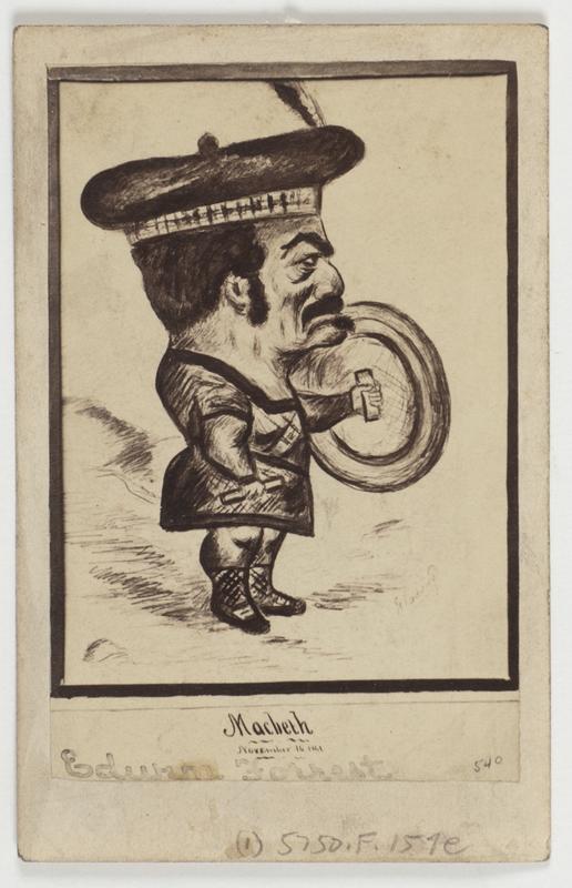Photographic reproduction of a caricature of Philadelphia actor Edwin Forrest in the character of Macbeth. Shows the actor in a Scotch cap and holding a shield.