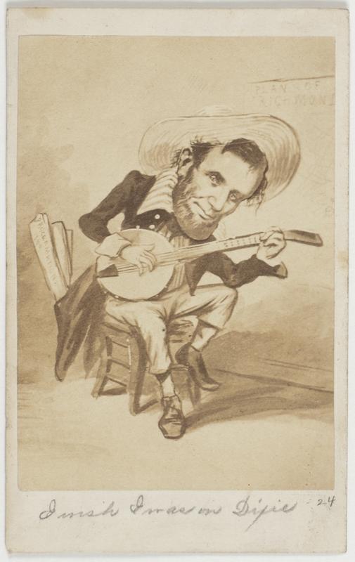 Photographic reproduction of a racist and anti-abolition caricature of Abraham Lincoln showing Lincoln as a banjo playing Southerner with a copy of the Emancipation Proclamation in his pocket.