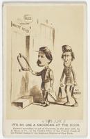 Photographic reproduction of a caricature showing George McClellan holding a valise labeled "Strategy" using the knocker of a door labeled "White House" and "1865." James Gordon Bennett, publisher of the New York Herald, attired as a Scotsman and holding a valise labeled "N.Y. Herald" accompanies the former commander-in-chief of the U.S. Army. The New York Herald published several stories critical of Lincoln's management of the war.
