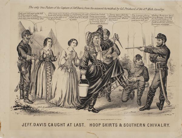 Cartoon satirizing the unusual circumstances of the capture of the Confederate president, detained by Union cavalry troops on May 10, 1865, while wearing his wife’s overcoat and shawl as a disguise. Depicts Jefferson Davis, attired in a bonnet, long-sleeved dress, and boots, holding a daggar as he is captured by Union soldiers. In the right, one soldier holds a rifle to Davis as another soldier crouches downs and lifts up his hoop skirt revealing his boots with spurs. In the left, two women speak to the soldiers that it is a "poor Grandma" and "poor mother" going to the "well for a bucket of water," and another soldier makes a joke about "Jack and Gill."