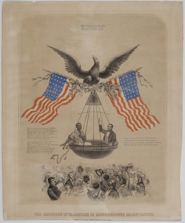 Cartoon evoking the Declaration of Independence to promote the emancipation from enslavement. Depicts rays of light representing God above a soaring American eagle that clutches olive and oak branches and two American flags labelled "All Men are Created Equal" and "Stand by the Declaration." Suspended from the flags is a large basket in which an African American man and a white man are seated. The African American man drops his broken shackles out of the basket as the abolitionist proclaims "Break Every Yoke; Let the Oppressed Go Free" to a large crowd of men, women, and children cheering below. Among the crowd is a white man Union soldier; a white newsboy selling the "Herald," an abolition newspaper; and a free African American man. Verses of text appear atop the rays of light and beside the basket espousing the religious, moral, and historical justifications for emancipation.
