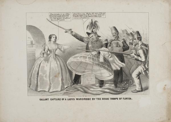 Cartoon concerning the enforcement of the Confiscation Act of 1861 depicting the absurd seizure of a Florida woman's wardrobe to "pay the expenses of the troops." A military officer, possibly Union General Winfield Scott, and his troops, bayonets and swords raised, collect the belligerent, Confederate belle's hoop skirt as they trample an American flag. The lady demands the return of her clothes or threatens to go to Union-occupied Fort Pickens (visible behind her) and "man one of the big guns, and blow [the men] to pieces."