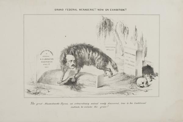 Title from below: The great Massachusetts Hyena, an Extraordinary Animal newly discovered, true to his traditional instincts, he violates the grave!.