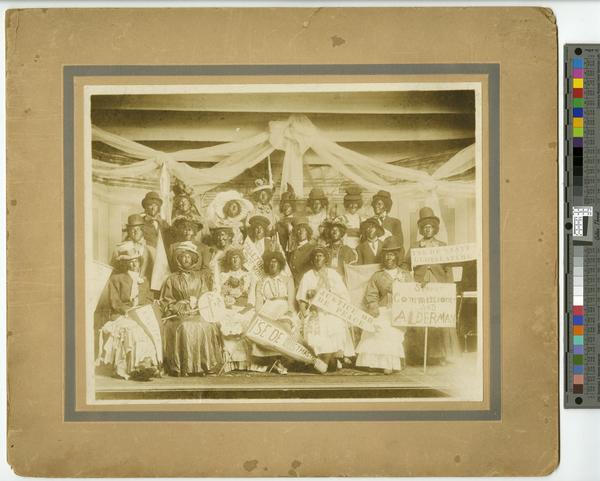 Group portrait of twenty-two women posed in three rows while wearing Blackface and comical costumes for the racist entertainmentof minstrelsy. The women in the front row are seated and the women in the back two rows stand. The female minstrel entertainers wear black curly haired wigs, black face paint, and different-styled hats, jackets, skirts, and/or dresses. Costumes include ruffled and wrinkled skirts, rumpled jackets, ties and bowties, bowler hats, top hats, and a large, wide-rimmed Edwardian picture hat. Several women hold stenciled or hand-written signs (with malapropisms) identifying their "character," often a government or civil employee. Signs, in various shapes and designs, read: "Sheriff"; "Ise De Librarian"; "Ise de [Post]master"; "Colletor [sic] Ob De Mon[ey]"; "Justice Ob De Peace"; "Street Commissioner and Alderman"; and "Ise De State Legislture." A backdrop is visible in the background and fabric runners are tied in a central bow above the women's heads. A piano is partially visible in the left of the image. Blackface minstrelsy is a popular entertainment form, originating in the United States in the mid-19th century and remaining in American life through the 20th century. The form is based around stereotypical and racist portrayals of African Americans, including mocking dialect, parodic lyrics, and the application of black face paint; all designed to portray African Americans as othered subjects of humor and disrespect. Blackface was a dominant form for theatrical and musical performances for decades, both on stage and in private homes. By the 1870s nearly a dozen all-female minstrel troupes had been organized. Many of the troupes eventually evolved into burlesque reviews.
