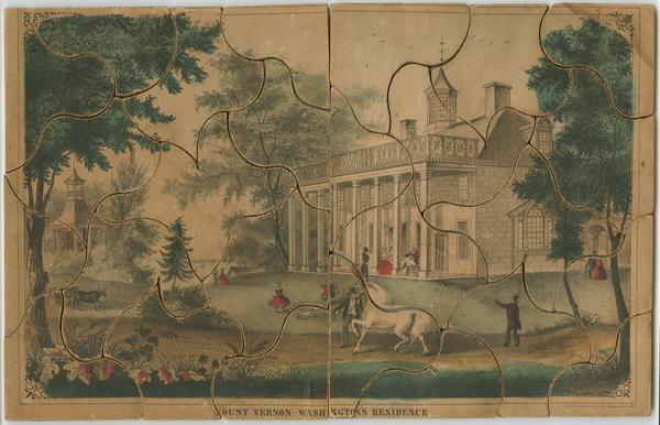 Puzzle showing the eastern facade of the mansion and grounds overlooking the Potomac River in Fairfax County, Virginia owned by George Washington. White men and women promenade, white children play with a dog, cattle graze, and a white man handler walks a horse on the landscaped grounds in the foreground. George Washington, Martha Washington, and a white woman sit on the porch. An enslaved African American man servant, attired in a white collared shirt, a black jacket with tails, and black pants, stands to the left of them. The estate, originally granted to Washington's great-grandfather John Washington in 1674, was inherited by George in 1761 and purchased by the Mount Vernon Ladies Association in 1858.
