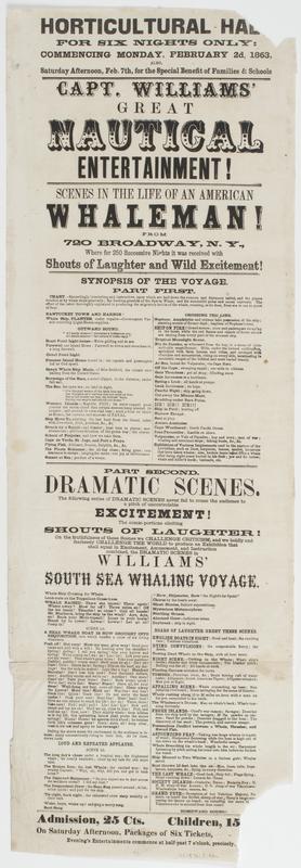 Horticultural Hall. For six nights only: : commencing Monday, February 2d, 1863, also, Saturday afternoon, Feb. 7th, for the special benefit of families and schools Capt. Williams' great nautical entertainment! Scenes in the life of an American whaleman! from 720 Broadway, N.Y., where for 250 successive nights it was received with shouts of laughter and wild excitement! ... Admission, 25 cts. Children, 15 cts. On Saturday afternoon, packages of six tickets, ... Evening's entertainments commence at half-past 7 o'clock, precisely.