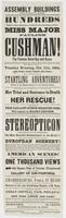 Assembly Buildings Tenth & Chestnut Streets. : Hundreds unable to gain admission, to listen to the charming and brave Miss Major Pauline Cushman! The famous Union spy and scout. This heroic and beautiful girl, whose glorious courage, unflinching personal sacrifices and wonderful exploits have been the theme of unbounded praise for the past year by the press throughout the country, North and South, will appear this Tuesday evening, Oct. 11th, 1864, (and every night during the week.) Miss Cushman will relate her startling adventures! while in the secret service of the United States. ... During the evening, to relieve Miss Major Cushman from the fatigue of giving the entire entertainment, the grand stereopticon (copyrighted by P.E. Abel, Philadelphia.) ... Admission, 25 cents Reserved seats, 50 cents. Seats can be procured at the ticket office from 10 A.M. till 12, M., and from 2 to 4, P.M. Doors open at 7 o'clock. To commence at 8 o'clock.