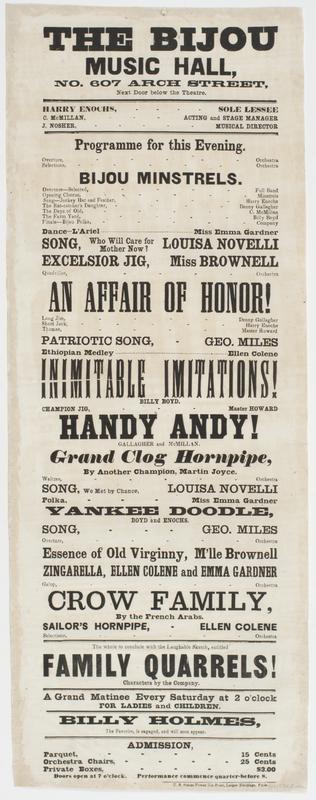 The Bijou Music Hall, No. 607 Arch Street, next door below the theatre. : Harry Enochs, sole lessee C. McMillan, acting and stage manager J. Nosher, musical director Programme for this evening. ... Bijou Minstrels. ... An affair of honor! ... Handy Andy! ... Yankee Doodle, ... Crow family, ... The whole to conclude with the laughable sketch, entitled Family quarrels! Characters by the company. A grand matinee every Saturday at 2 o'clock for ladies and children. Billy Holmes, the favorite, is engaged, and will soon appear. Admission, Parquet, 15 cents Orchestra chairs, 25 cents Private boxes, $3.00 Doors open at 7 o'clock. Performance commence quarter-before 8.