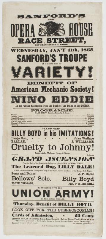 Sanford's new Opera House Race Street, between Second & Third, : Wednesday, Jan'y 11th, 1865 Sanford's Troupe in a grand bill of variety! Benefit of American Mechanic Society! Nino Eddie in his great ascension from the back of the stage to the ceiling. Programme. ... Cruelty to Johnny! ... To conclude with The Union Army! by the entire company. Thursday, benefit of Billy Boyd. Look out for the Stereoscopian! Cards of admission, 25 cents Orchestra seats, 50 cts Private boxes, dress circle, $5 Private boxes, family circle, $4 & $3 Office will be open from 9 to 2 o'clock, for the sale of secured seats and boxes, without extra charge. Doors open at quarter before 7 o'clock. To commence quarter before 8