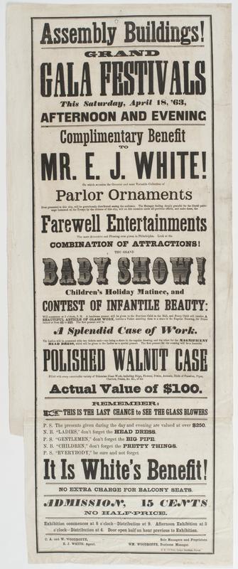 Grand gala festivals this Saturday, April 18, '63 afternoon and evening : Complimentary benefit to Mr. E.J. White! on which occasion the greatest and most valuable collection of parlor ornaments ever presented in this city, will be gratuitously distributed among the audience. The manager feeling deeply grateful for the liberal patronage bestowed on the troupe by the citizens of this city, will on this occasion outdo all previous efforts, and make these, the farewell entertainments the most attractive and pleasing ever given in Philadelphia. Look at the combination of attractions! The grand baby show! Children's holiday matinee, and contest of infantile beauty: will commence at 3 o'clock, P.M. A handsome present will be given to the prettiest child in the hall, and every child will receive a beautiful article of glass work, besides a ticket entitling them to a share in the regular drawing, for prizes valued at from $2 to $25. The first present will be a splendid case of work. ... The first present for the evening will be a beautiful polished walnut case ... of the actual value of $100. Remember: this is the last chance to see the glass blowers ... No extra charge for balcony seats. Admission, 15 cents No half-price. Exhibition commences at 8 o'clock--distribution at 9. Afternoon exhibition at 3 o'clock--distribution at 4. Door open half an hour previous to exhibition. / C.A. and W. Woodroffe, sole managers and proprietors E.J. White, agent. Wm. Woodroffe, business manager.