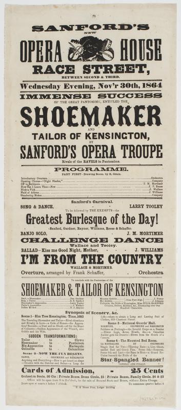 with the pantomime of The shoemaker & tailor of Kensington ... Cards of admission, 25 cents Orchestra seats, 50 cts Private