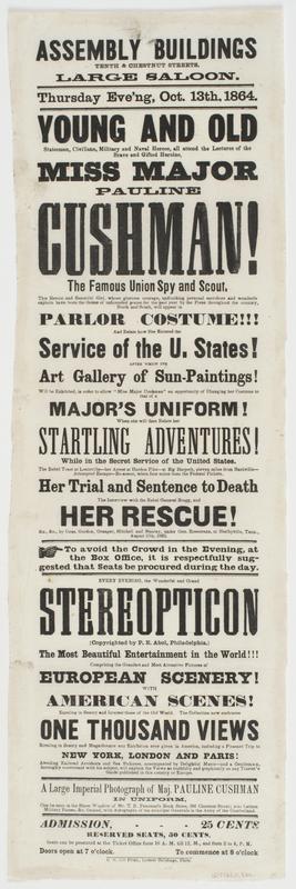 Assembly Buildings Tenth & Chestnut Streets. Large saloon. Thursday eve'ng, Oct. 13th, 1864. : Young and old statesmen, civilians, military and naval heroes, all attend the lectures of the brave and gifted heroine Miss Major Pauline Cushman! The famous Union spy and scout. This heroic and beautiful girl, whose glorious courage, unflinching personal sacrifices and wonderful exploits have been the theme of unbounded praise for the past year by the press throughout the country, North and South, will appear in parlour costume!!! and relate how she entered the service of the U. States! After which the art gallery of sun-paintings! will be exhibited, in order to allow "Miss Major Cushman" an opportunity of changing her costume to that of a major's uniform! when she will then relate her startling adventures! while in the secret service of the United States. ... Every evening, the wonderful and grand stereopticon (Copyrighted by P.E. Abel, Philadelphia.) ... Admission, 25 cents Reserved seats, 50 cents. Seats can be procured at the ticket office from 10 A.M. till 12, M., and from 2 to 4, P.M. Doors open at 7 o'clock. To commence at 8 o'clock.
