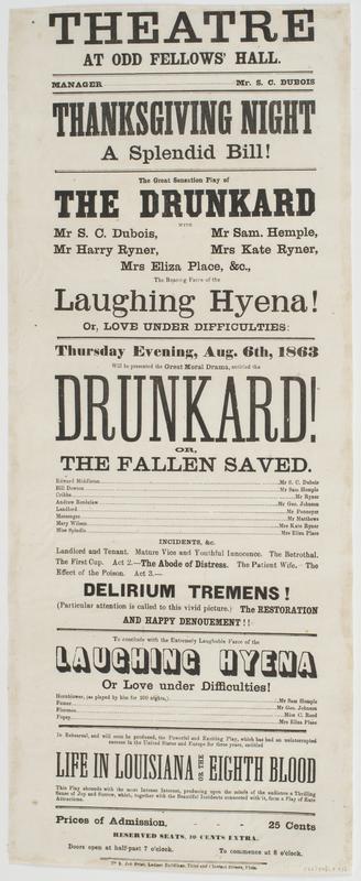Theatre at Odd Fellows' Hall. : Manager Mr. S.C. Dubois Thanksgiving night a splendid bill! ... Thursday evening, Aug. 6, 1863 will be presented the great moral drama, entitled The drunkard! or, The fallen saved. ... To conclude with the extremely laughable farce of The laughing hyena or Love under difficulties! ... In rehearsal, and will soon be produced, the powerful and exciting play, which has had an uninterrupted success in the United States and Europe for three years, entitled Life in Lousiana or The eighth blood ... Prices of admission, 25 cents Reserved seats, 10 cents extra. Doors open at half-past 7 o'clock. To commence at 8 o'clock.