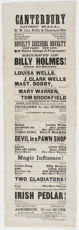Canterbury Music Hall, N.W. cor. Fifth & Chestnut Sts : Sole lessee, John H. Chilcott Business manager, John Cathcart Stage manager, Ed. Preble Novelty succeeds novelty New faces! New acts! Entire change of programme! Benefit of Billy Holmes! This evening. Engagement of the charming vocalist, for a limited period, Louisa Wells. Engagement of the great Ethiopian comedian and bone soloist, J. Clark Wells Mast. Bobby, ... Mary Warren, ... Tom Brookfield ... Programme for this evening ... Canterbury Minstrels. ... Devil in a pawn shop ... Magic influence! ... Two gladiators! ... The performance to conclude with the laughable afterpiece, entitled The Irish pedlar! ... Doors open at 6 o'clock. Commence at 8. Admission, 10 and 20 cts. Private boxes, $3. Single seats, 50 cents. The great extemporaneous and comic singer, Fred Shaw, will appear on Wednesday evening, December 7th, 1864.