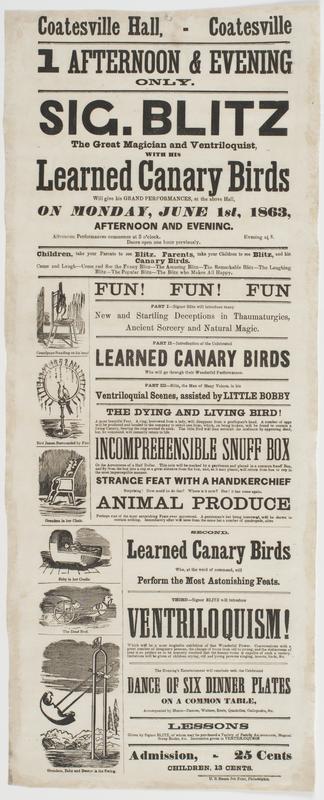 Coatesville Hall, Coatesville : 1 afternoon & evening only. Sig. Blitz the great magician and ventriloquist, with his learned canary birds will give his grand performances, at the above hall, on Monday, June 1st, 1863, afternoon and evening. Afternoon performances commence 3 o'clock; evening at 8. Doors open one hour previously. Children, take your parents to see Blitz. Parents, take your children to see Blitz, and his canary birds. ... The evening's entertainment will conclude with the celebrated Dance of six dinner plates on a common table, ... Lessons given by Signor Blitz, of whom may be purchased a variety of family amusements, magical scrap books, &c. Instruction given in ventriloquism. Admission, 25 cents Children, 13 cents.