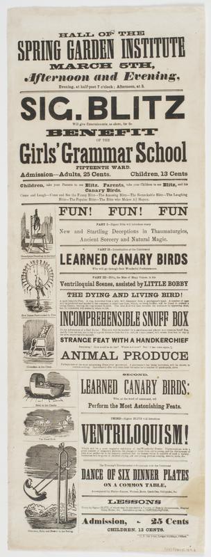 Hall of the Spring Garden Institute : March 5th, afternoon and evening, evening, at half-past 7 o'clock; afternoon at 3. Sig. Blitz will give entertainments, as above, for the benefit of the Girls' Grammar School Fifteenth Ward. Admission--Adults, 25 cents. Children, 13 cents Children, take your parents to see Blitz. Parents, take your children to see Blitz and his canary birds. ... The evening's entertainment will conclude with the celebrated Dance of six dinner plates on a common table, ... Lessons given by Sig. Blitz, of whom may be purchased a variety of family amusements, magical scrap books, &c. Instruction given in ventriloquism. Admission, 25 cents Children, 13 cents.