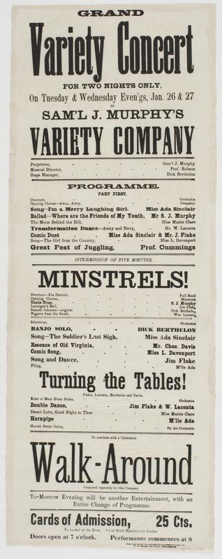 Grand variety concert for two nights only, : on Tuesday & Wednesday even'gs, Jan. 26 & 27 by Sam'l J. Murphy's Variety Company ... Programme. ... Minstrels! ... Turning the tables! ... To conclude with a celebrated walk-around composed expressly for this company. To-morrow evening will be another entertainment, with an entire change of programme. Cards of admission, 25 cts. to be had at the door. Front seats reserved for ladies. Doors open at 7 o'clock. Performance commences at 8