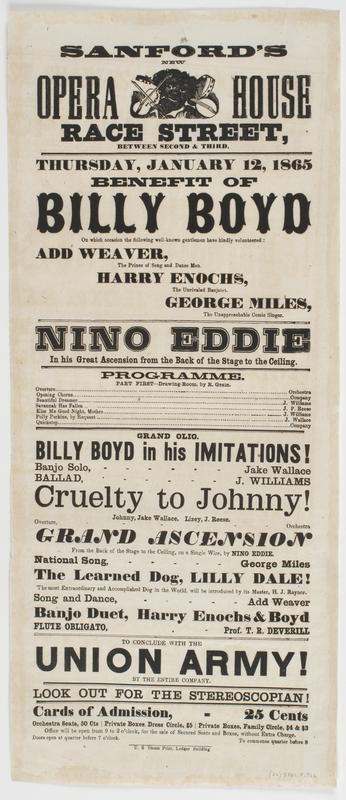 Sanford's new Opera House Race Street, between Second & Third, : Thursday, January 12, 1865 Benefit of Billy Boyd on which occasion the following well-known gentlemen have kindly volunteered: Add Weaver, ... Harry Enochs, ... George Miles, ... Nino Eddie in his great ascension from the back of the stage to the ceiling. Programme. ... Cruelty to Johnny! ... To conclude with The Union Army! by the entire company. Look out for the Stereoscopian! Cards of admission, 25 cents Orchestra seats, 50 cts Private boxes, dress circle, $5 Private boxes, family circle, $4 & $3 Office will be open from 9 to 2 o'clock, for the sale of secured seats and boxes, without extra charge. Doors open at quarter before 7 o'clock. To commence quarter before 8