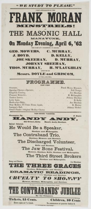 "We study to please." : First appearance of the Frank Moran Minstrels! at the Masonic Hall Manayunk, on Monday evening, April 6, '62 ... Handy Andy, ... He would be a speaker ... The contraband trip, ... The discharged volunteer, ... The jaw bone festival, ... The Third Street brokers ... The three graces ... Cruelty to Shonny ... The whole to conclude with the plantation scene, entitled The contrabands' jubilee by the company. Tickets, 15 cents. Children, 10 cents Doors open at 7 o'colck. To commence at quarter before 8.