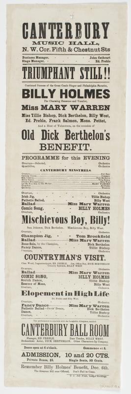 Canterbury Music Hall, N.W. cor. Fifth & Chestnut Sts : Business manager, John Cathcart Stage manager, Ed. Preble Triumphant still!! Continued success of the great comic singer and Philadelphia favorite, Billy Holmes The charming danseuse and vocalist, Miss Mary Warren ... and a host of volunteers, on the occasion of Old Dick Berthelon's benefit. Programme for this evening. ... Canterbury Minstrels. ... Mischievous boy, Billy! ... Countryman's visit. ... Elopement in high life ... The performance to conclude with the laughable afterpiece, entitled Canterbury ball room ... Doors open at 6 o'clock. Commence at 8 Admission, 10 and 20 cts. Private boxes, $3. Single seats, 50 cents. Remember Billy Holmes' benefit, Dec. 6th. The greatest bill ever offered. Don't fail to come.