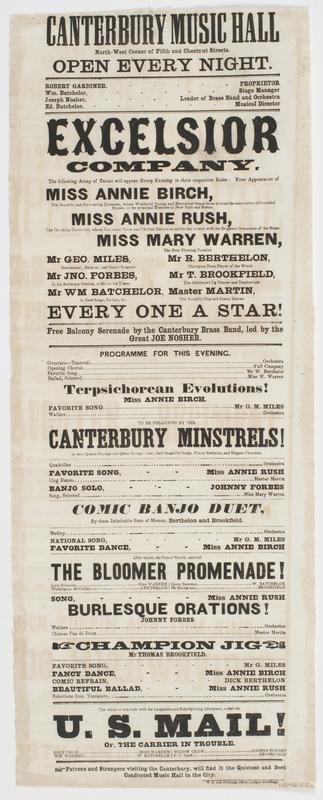 Canterbury Music Hall North-West corner of Fifth and Chestnut Streets. Open every night. : Robert Gardiner, proprietor ... Excelsior company. The following array of talent will appear every evening in their respective roles: First appearance of Miss Annie Birch, the beautiful and fascinating danseuse, ... Miss Annie Rush, the charming cantatrice, ... Miss Mary Warren, the ever pleasing vocalist. ... Free balcony serenade by the Canterbury Brass Band, led by the great Joe Nosher. Programme for this evening. ... Canterbury Minstrels! ... The whole to conclude with the laughable and side-splitting afterpiece, called The U.S. Mail! or, The carrier in trouble. ... Patrons and strangers visiting the Canterbury, will find it the quietest and best conducted music hall in the city.