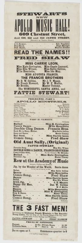 Stewart's New Apollo Music Hall! : 609 Chestnut Street, and 608, 610 and 612 Jayne Street, (entrance on Chestnut Street.) J.C. Stewart, sole proprietor Fred Shaw, stage manager Prof. Knoth, musical director Read the names!! First week of Fred Shaw the American extemporaneous comic vocalist. Miss Carrie Leon, Miss Kate Covington, Miss Cassie, Leonard, Miss Ella Wilson, Miss Sallie Collins, M'lle Henrietta, Miss Ida May, Miss Augusta Francis, the Francis Brothers Mr D.W. Collins, Mr J.T. Mason, Mr Frank Howard, Mr W.F. Mullin, Mr Brooks, Master Tommy, the wonderful Santa Anna, and Fattie Stewart! the prince of Ethiopian comedians and comic delineators. ... Row at the Academy of Music ... The whole to conclude with a scene fron The 3 fast men! ... Prices of admission. Parquet, 15 cts Orchestra seats, 25 " Private boxes, $5 00 Seat in do. 50 cts Doors open at 7. Commence quarter to 8