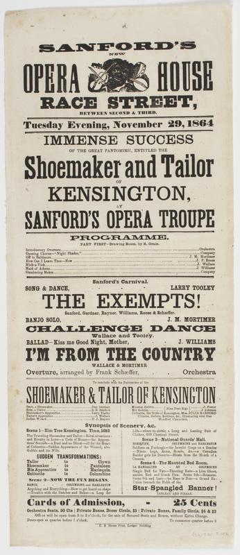 great pantomime, entitled The shoemaker and tailor of Kensington, by Sanford's Opera Troupe Programme. ... The exempts! ...