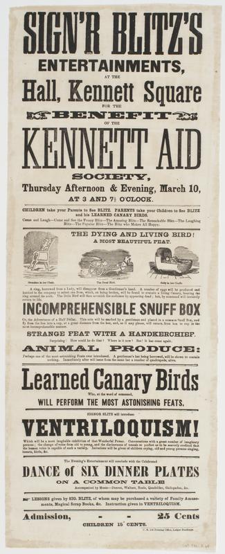 Sign'r Blitz's entertainments, at the hall, Kennett Square for the benefit of the Kennett Aid Society, : Thursday afternoon & evening, March 10, at 3 and 7 1/2 o'clock. Children take your parents to see Blitz. Parents take your children to see Blitz and his learned canary birds. ... The evening's entertainment will conclude with the celebrated Dance of six dinner plates on a common table ... Lessons given by Sig. Blitz, of whom may be purchased a variety of family amusements, magical scrap books, &c. Instruction given in ventriloquism. Admission, 25 cents Children 15 cents.