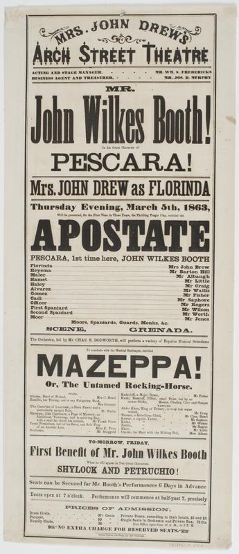 Mr. John Wilkes Booth! in his great character of Pescara! : Mrs. John Drew as Florinda Thursday evening, March 5th, 1863,