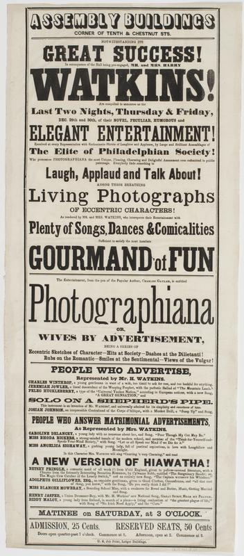 Notwithstanding its great success! : in consequence of the hall being pre-engaged, Mr. and Mrs. Harry Watkins! are compelled to announce as the last two nights, Thursday & Friday, Dec. 29th and 30th, of their novel, peculiar, humorous and elegant entertainment! received at every representation with enthusiastic shouts of laughter and applause, by large and brilliant assemblages of the elite of Philadelphian society! ... The entertainment, from the pen of the popular author, Charles Gayler, is entitled Photographiana or, Wives by advertisement, being a series of eccentric sketches of character ... Matinee on Saturday, at 3 o'clock. Admission, 25 cents. Reserved seats, 50 cents Doors open quarter-past 7 o'clock. Commence at 8. Afternoon, open at 2. Commence at 3.