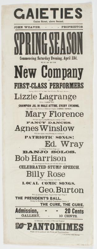 Spring season commencing Saturday evening, April 23d, : with an entire new company of first-class performers among whom will be found the following talented artists: Lizzie Lagrange will dance her champion jig, in male attire, every evening, also sing a great variety of new and original comic songs. Mary Florence will also appear every evening in a variety of new fancy dances. Agnes Winslow will also appear every evening in a variety of patriotic songs! Ed. Wray in a budjet [sic] of comic songs and banjo solos. Bob Harrison in new songs and dances, and will also deliver his celebrated stump speech. Billy Rose will also sing a variety of his best local comic songs. Geo. Burton will, by particular desire, sing his new comic song of The president's ball. During the evening, the laughable Terpsichorean quartet, of The cure, the cure. Admission, 20 cents Gallery, 10 cents. In rehearsal, a variety of new and original pantomimes which will be produced with tricks and transformations.