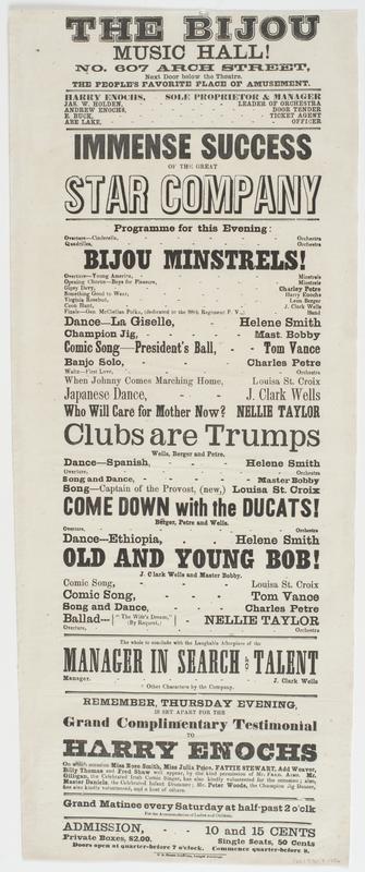 The Bijou Music Hall! No. 607 Arch Street, next door below the theatre. The people's favorite place of amusement. : Harry Enochs, sole proprietor & manager Jas. W. Holden, leader of orchestra Andrew Enochs, door tender E. Buck, ticket agent Abe Lake, officer Immense success of the great star company Programme for this evening: ... Bijou Minstrels! ... Clubs are trumps ... Come down with the ducats! ... Old and young Bob! ... The whole to conclude with the laughable afterpiece of The manager in search of talent ... Remember, Thursday evening, is set apart for the grand complimentary testimonial to Harry Enochs on which occasion Miss Rose Shaw, Miss Julia Price, Fattie Stewart, Add Weaver, Billy Thomas and Fred Shaw will appear, by the kind permission of Mr. Fred. Aims. Mr. Gilligan, the celebrated Irish comic singer, has also kindly volunteered for the occasion; also, Master Daniels, the celebrated infant drummer; Mr. Peter Woods, the champion jig dancer, has also kindly volunteered, and a host of others. Grand matinee every Saturday at half-past 2 o'clk for the accommodation of ladies and children. Admission, 10 and 15 cents Private boxes, $2.00. Single seats, 50 cents Doors open at quarter-before 7 o'clock. Commence quarter-before 8.