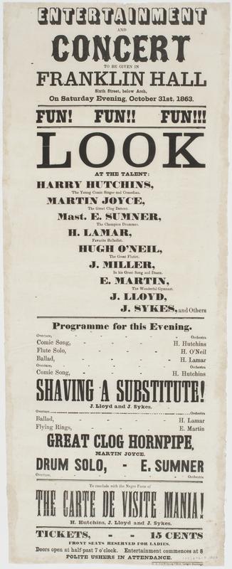 Entertainment and concert to be given in Franklin Hall : Sixth Street below Arch, on Saturday evening, October 31st, 1863. Fun! Fun!! Fun!!! Look at the talent: Harry Hutchins, the young comic singer and comedian. Martin Joyce, the great clog dancer. Mast. E. Sumner, the champion drummer. H. Lamar, favorite balladist. Hugh O'Neil, the great flutist. J. Miller, in his great song and dance. E. Martin, the wonderful gymnast. J. Lloyd, J. Sykes, and others. Programme for this evening. ... Shaving a substitute! ... To conclude with the negro farce of The carte de visite mania! ... Tickets, 15 cents Front seats reserved for ladies. Doors open at half-past 7 o'clock. Entertainment commences at 8 Polite ushers in attendance.