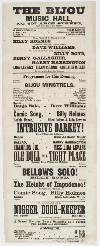 The Bijou Music Hall, No. 607 Arch Street, next door below the theatre. : Harry Enochs, sole lessee C. McMillan, acting and stage manager ... Third week of the engagement of Billy Holmes, the favorite comic singer. Second week of Dave Williams, the greatest banjo player living. Continued success of Billy Boyd, Denny Gallagher, Harry Harrington Lida Levans, Ellen Colene, Adelaide Miller together with the entire star company. Programme for this evening. ... Bijou Minstrels. ... Intrusive darkey! ... Ole Bull in a tight place ... The height of impudence! ... The whole to conclude with The nigger door-keeper ... A grand matinee every Saturday at 2 o'clock for ladies and children. Admission, Parquet, 15 cents Orchestra chairs, 25 cents Private boxes, $2.00 Single seats, 50 cents Doors open at 7 o'clock. Performance commence quarter-before 8.