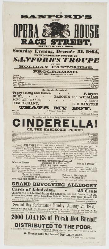 Sanford's new Opera House Race Street, between Second & Third, : Saturday evening, Decem'r 31, 1864, unprecedented success of Sanford's Troupe and the holiday pantomime. Programme. ... That's my boy. ... To conclude with the grand fairy operatic pantomime of Cinderella! or, The harlequin prince. ... Cards of admission, 25 cents Children will be admitted during the holidays, with their parents, at 15 cts. Orchestra seats, 50 cts Private boxes, dress circle, $5 Private boxes, family circle, $4 & $3 Office will be open from 9 to 2 o'clock, for the sale of secured seats and boxes, without extra charge. Doors open at quarter before 7 o'clock. To commence quarter before 8 Second day performance Monday, January 2d, 1865, order of the day--The pantomime of Cinderella will be performed at 10 o'clock, A.M., especially for the poor, who are unable to spend their money for amusements. A few reserved seats for those who wish to pay. The proceeds to be devoted to the poor. Immediately after this performance, 2000 loaves of fresh hot bread! will be distributed to the poor. A grand extra afternoon performance, half-past 2 o'clock, when the minstrels will perform and the pantomime will be presented. On Monday next, the learned dog, Lilly Dale.