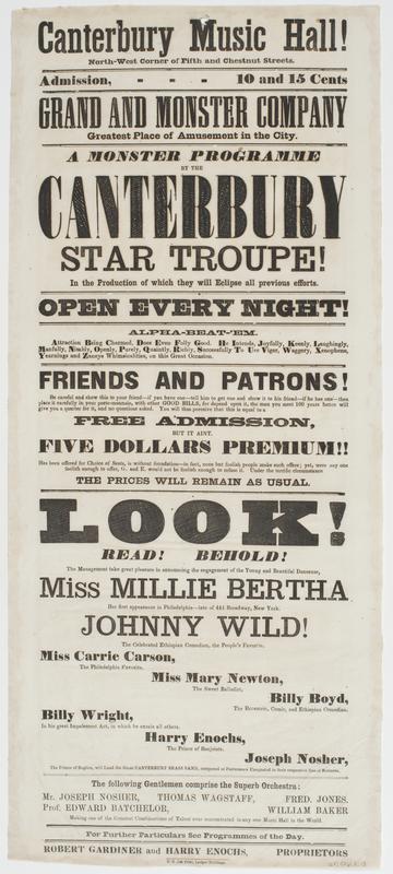 Canterbury Music Hall! North-West corner of Fifth and Chestnut Streets. : Admission, 10 and 15 cents Grand and monster company Greatest place of amusement in the city. A monster programme by the Canterbury star troupe! In the production of which they will eclipse all previous efforts. Open every night! Alpha-beat-'em. Attraction being charmed, does even folly good. He intends, joyfully, keenly, laughingly, manfully, nimbly, openly, purely, quaintly, richly, successfully to use vigor, waggery, xenophene, yearnings and zaneys whimsicalities, on this great occasion. ... For further particulars see programmes of the day. / Robert Gardiner and Harry Enochs, proprietors.
