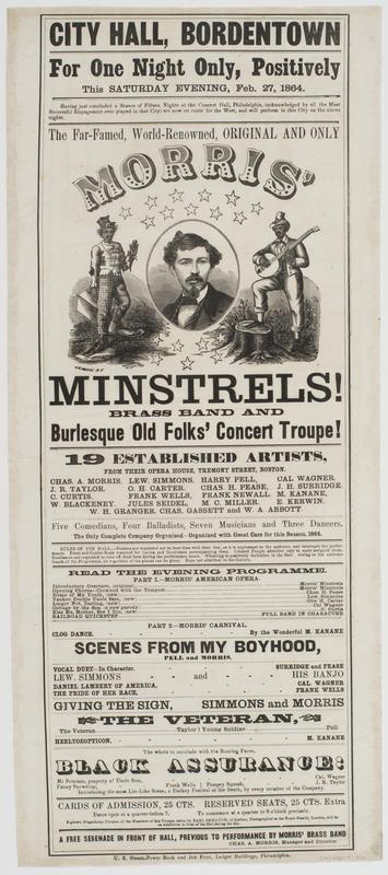 and only Morris' Minstrels! brass band and burlesque old folks' concert troupe! 19 established artists, from their opera house,