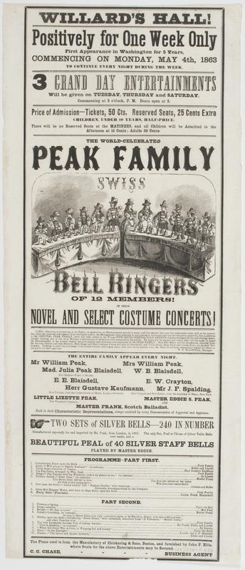 at 15 cents; adults 50 cents. The world-celebrated Peak Family Swiss bell ringers of 12 members! In their novel and select