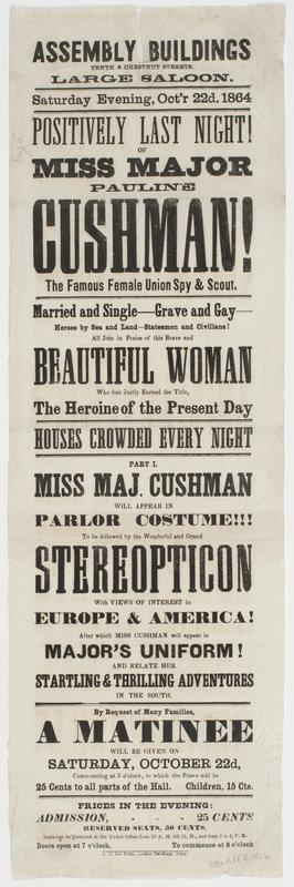 Assembly Buildings Tenth & Chestnut Streets. Large saloon. Saturday evening, Oct'r 22d, 1864 : Positively last night! of Miss Major Pauline Cushman! The famous female Union spy & scout. Married and single--grave and gay--heroes by sea and land--statesmen and civilians! All join in praise of this brave and beautiful woman who has justly earned the title, the heroine of the present day Houses crowded every night Part I. Miss Maj. Cushman will appear in parlor costume!!! To be followed by the wonderful and grand stereopticon with views of interest in Europe & America! After which Miss Cushman will appear in major's uniform! and relate her startling & thrilling adventures in the South. By request of many families, a matinee will be given on Saturday, October 22d, commencing at 3 o'clock, to which the prices will be 25 cents to all parts of the hall. Children, 15 cts. Prices in the evening: Admission, 25 cents Reserved seats, 50 cents. Seats can be procured at the ticket office from 10 A.M. till 12, M., and from 2 to 4, P.M. Doors open at 7 o'clock. To commence at 8 o'clock.