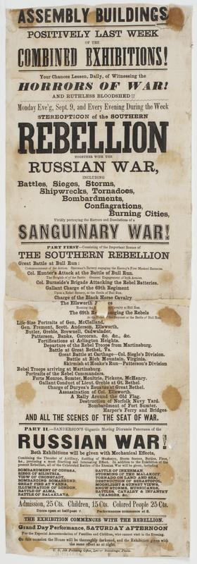 Assembly Buildings Positively last week of the combined exhibitions! : Your chances lessen, daily, of witnessing the horrors of war! and ruthless bloodshed!! Monday eve'g, Sept. 9, and every evening during the week stereopticon of the Southern Rebellion together with the Russian war, ... Admission, 25 cts. Children, 15 cts. Colored people 25 cts. Doors open at half-past 7. Performances commence at 8. The exhibition commences with the Rebellion. Grand day performance, Saturday afternoon for the especial accommodation of families and children, who cannot visit in the evening. On this occasion the house will be thoroughly darkened, and the exhibition given with the same effect as at night.
