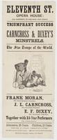 Eleventh St. Opera House: (late Sanford's,) : Eleventh Street, above Chestnut. Triumphant success of Carncross & Dixey's Minstrels. The star troupe of the world. Frank Moran, the great original comedian. J.L. Carncross, the unrivalled balladist. E.F. Dixey, the celebrated comedian. Together with 15 star performers who appear nightly Admission, 25 cents. Children, 13 cents. Doors open at 7 o'clock. Commence at 8 o'clock. Box office open from 10 till 3 o'clock. Seats secured without extra charge.