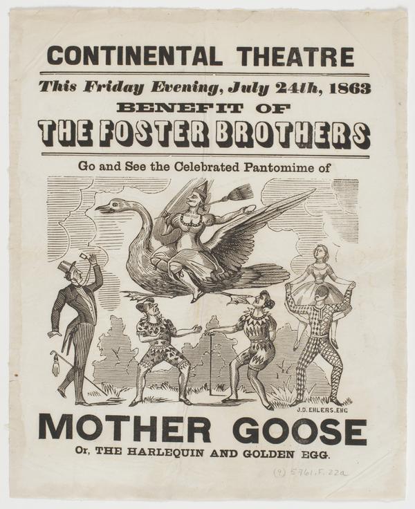 This Friday evening, July 24th, 1863 Benefit of the Foster brothers : Go and see the celebrated pantomime of Mother Goose or, The harlequin and golden egg.
