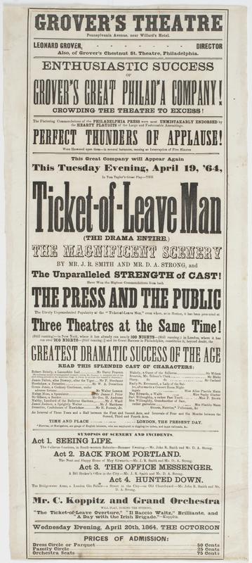 great company will appear again this Tuesday evening, April 19, '64, in Tom Taylor's great play--The ticket-of-leave man ...