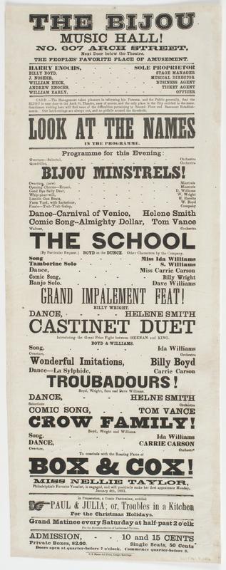 The Bijou Music Hall! No. 607 Arch Street, next door below the theatre. The peoples' favorite place of amusement. : Harry
