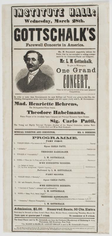 Institute Hall: Wednesday, March 28th. Gottschalk's farewell concerts in America. : Mr. M. Strakosch respectfully informs the public that he has succeeded in making arrangements for the celebrated pianist and composer, Mr. L.M. Gottschalk, to give in Wilmington one grand concert, when he will perform several of his most admired compositions. In order to make these entertainments the most brilliant and varied ever given in this city, the following distinguished artists have been engaged, and will appear jointly with L.M. Gottschalk: Mad. Henriette Behrens, ... Theodore Habelmann, ... Sig. Carlo Patti, ... Musical director and conductor, Mr. S. Behrens ... Admission, $1.00. Reserved seats, 50 cts. extra ... Doors open at quarter-past 7 o'clock. To commence at 8 o'clock. ...