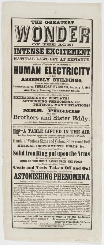 The greatest wonder of the age! Intense excitement Natural laws set at defiance! : A course of lectures will be delivered on human electricity at the Assembly Buildings, corner of Tenth and Chestnut Streets, commencing on Thursday evening, January 5, 1865 and every evening until further notice. These lectures will be illustrated by the most extraordinary displays! astounding phenomena, and physical manifestations! through Mrs. Ferris and the brothers and sister Eddy: and which set at defiance gravitation and other known laws. ... A committee will be selected nightly by the audience Doors open at half-past 6. To commence at half-past 7. Admission, 50 cents. Reserved front seats, 75 cents may be secured daily at the box office, from 10 to 12 A.M., and from 3 to 5 P.M.