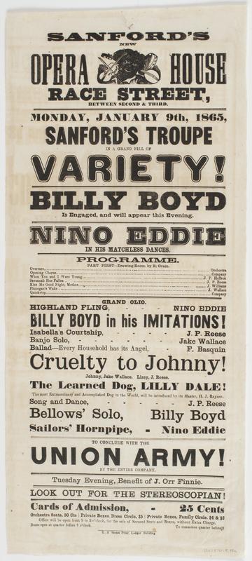 Sanford's new Opera House Race Street, between Second & Third, : Monday, January 9th, 1865, Sanford's Troupe in a grand bill of variety! Billy Boyd is engaged, and will appear this evening. Nino Eddie in his matchless dances. Programme. ... Cruelty to Johnny! ... To conclude with The Union Army! by the entire company. Tuesday evening, benefit of J. Orr Finnie. Look out for the Stereoscopian! Cards of admission, 25 cents Orchestra seats, 50 cts Private boxes, dress circle, $5 Private boxes, family circle, $4 & $3 Office will be open from 9 to 2 o'clock, for the sale of secured seats and boxes, without extra charge. Doors open at quarter before 7 o'clock. To commence quarter before 8