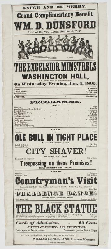 Laugh and be merry. : Grand complimentary benefit to Wm. D. Dunsford late of Co. "F," 196th Regiment, P.V. The Excelsior Minstrels