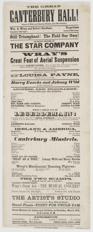 The great Canterbury Hall! Corner of Fifth and Chestnut Streets, (late New Grotto.) : Wm. A. Wray and Robert Gardiner, proprietors Theodore Boettger, musical director Still triumphant! The field our own! Glorious success of the star company equaled by few, excelled by none. Wray's great feat of aerial suspension ... Continued furore to see Louisa Payne, the best vocalist in the city. Harry Enochs and Johnny Wild in new comicalities. Another new programme: ... Canterbury Minstrels ... Grand matinee for ladies and children on Saturday, March 15th, at 2 o'clock, P.M. Admission. Parterre, 15 cents. Family circle, 10 cents Private boxes, two dollars. Single seats, fifty cents Grand balcony serenade by the Canterbury Brass Band, previous to commencing.