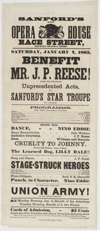 Sanford's new Opera House Race Street, between Second & Third, : Saturday, January 7, 1865, benefit of Mr. J.P. Reese! when the following unprecedented acts, by Sanford's star troupe will be presented. Programme. ... Cruelty to Johnny. ... Stage-struck heroes ... To conclude with The Union Army! by the entire company. Monday evening, Jan. 9, benefit of the attachees Tuesday evening, benefit of J. Orr Finnie Cards of admission, 25 cents Orchestra seats, 50 cts Private boxes, dress circle, $5 Private boxes, family circle, $4 & $3 Office will be open from 9 to 2 o'clock, for the sale of secured seats and boxes, without extra charge. Doors open at quarter before 7 o'clock. To commence quarter before 8